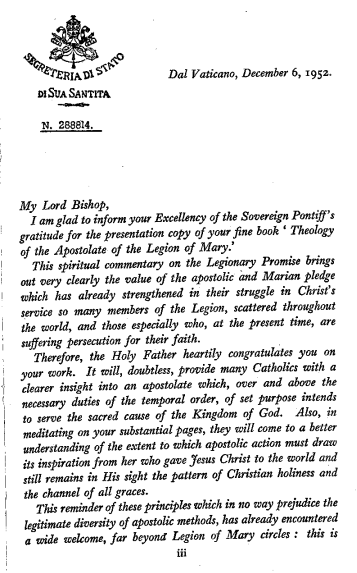 이런 점에서 교황님께서는 주교님이 하신 일에 대하여 진심으로 축하하셨습니다. 이 책은 많은 가톨릭 신자들에게 세상의 질서가 요구하는 의무를 훨씬 뛰어넘어, 확고한 마음으로 하느님 왕국 건설이라는 신성한 원의에 봉사하는 사도직에 대하여 더욱 분명한 통찰을 제공할 것임은 의심할 여지가 없습니다.