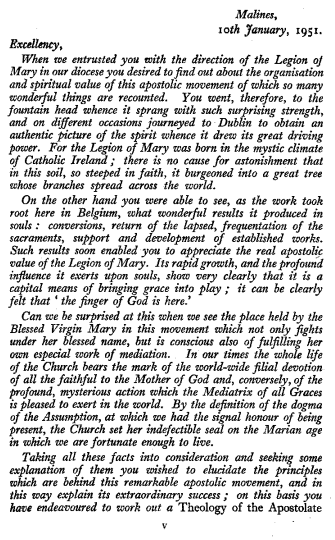 한편 주교님께서는 이 활동이 이곳 벨기에에서 뿌리를 내리면서 개종, 회심, 냉담자들의 회두, 열심한 성사 참례, 기존의 사업들에 대한 지원과 개선 등 이 활동이 영혼들 안에 어떤 놀라운 결과를 가져왔는지 볼 수 있으셨습니다. 그런 결과들로 말미암아 주교님께서는 얼마 안 가서 레지오 마리애의 사도직의 실제적인 가치를 인정하게 되셨습니다. 빠르게 이룬 성장과 영혼들에게 미치는 깊은 영향력은 이 단체가 은총이 베풀어지도록 하는 주요한 연장이라는 것을 매우 분명하게 보여줍니다. 또한 "이곳에 하느님의 손가락이 있음"을 명확하게 느낄 수 있습니다.