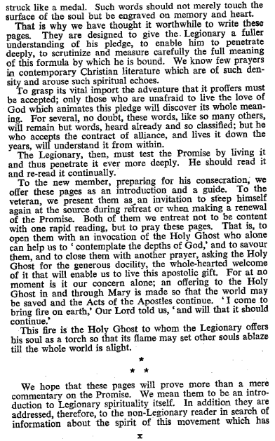 그런 점에서 우리는 이 책을 쓰는 것이 가치 있는 일이라고 생각했습니다. 이 책은 레지오 단원이 그가 하는 서약에 대하여 좀 더 완전한 이해를 갖게 하여, 그가 매이게 된 이 서약의 구성 원리에 대한 완전한 의미에 대하여 깊게 뚫고 들어가서 신중하게 따져보고 알아보도록 하려는 것입니다. 오늘날 기독교 문학에서 이토록 내용이 풍부하고 영적인 반향을 일으키는 기도문은 거의 없다고 생각합니다.