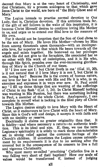 레지오는 우리의 모후께 정상적인 신심 즉, 그리스도교 신자로서의 신심을 실천하려고 하는 것입니다. 이러한 원의가 우리를 멀리 이끌어 이 통찰의 결과로서 자신을 봉헌하는 행위가 따른다면, 그것은 그리스도께서 우리 안에서 친히 그분의 어머니를 사랑하기를 계속하시기 때문이며, 우리의 자녀다운 사랑이 그리스도께서 하시는 정도까지 확장되도록 우리를 촉구하시기 때문입니다.
