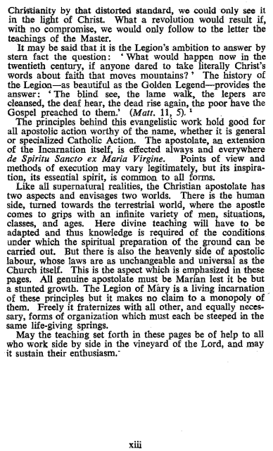 모든 초자연적인 실재가 그렇듯이 그리스도교의 사도직 역시 두가지 측면을 가지고 있으며 두 개의 세계를 바라보고 있습니다. 지상의 세계를 향하고 있는 인간의 입장에서 사도는 사람, 상황, 계층, 연령으로 이루어진 무한한 다양성과 마주하게 됩니다. 여기서 신성한 가르침이 적절하게 사용되어야 할 것입니다. 따라서 땅의 영적인 준비가 이루어질 수 있게 하는 조건에는 지식이 요구됩니다. 그런데 사도직의 업무에는 하늘의 입장도 있으며, 그 법은 교회 자체와 마찬가지로 불변이고 보편적입니다. 이 책에서 강조하고 있는 측면이 이것입니다. 모든 진정한 사도직은 성모님의 것(*역주: Marian)이 되어야 하고, 그렇지 않으면 결국 성장이 저해당하게 될 것입니다. 레지오 마리애는 이런 원리의 살아있는 화신이지만, 그 원리에 대한 독점권을 주장하지는 않습니다. 레지오 마리애는, 동일한 생명의 샘에 깊숙히 잠겨있는, 똑같은 필요성을 지닌 모든 다른 형태의 조직체들과 자유롭고 거리낌없이 사귑니다.
