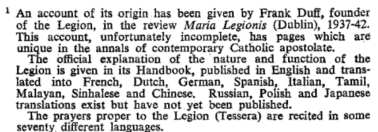 1937년부터 1942까지 출판된 마리아 레지오니스 잡지(더블린)에서 레지오의 기원에 대한 기사가 레지오 마리애의 창설자인 프랭크 더프에 의해 연재되었다. 이 기사는 현대의 가톨릭 사도직의 연대기(애석하게도 불완전하지만)에서 독특한 내용들을 담고 있다.